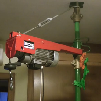 • Un maquinillo para elevar materiales pesados (los hay de distinta fuerza. Se sugiere que sea capaz de elevar un peso bastante superior al de la persona que va a usar la grúa, para mayor seguridad y para que no sea necesario cambiarlo en caso de que la persona gane peso con el paso de los años). El maquinillo viene provisto de mando para accionar la subida y bajada, así como de los enganches para sujetarlo al puntal.
