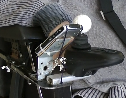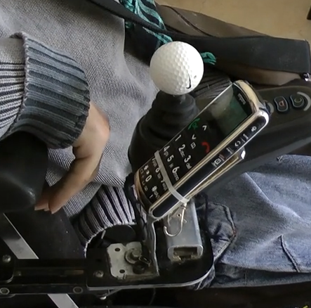 Adaptación para sujetar el móvil a la silla de ruedas. Su objetivo es que el usuario de silla de ruedas, con movilidad limitada en las extremidades superiores, pueda usar el móvil de forma autónoma y segura, sin que se le caiga y sin necesidad de que otra persona se lo sujete.