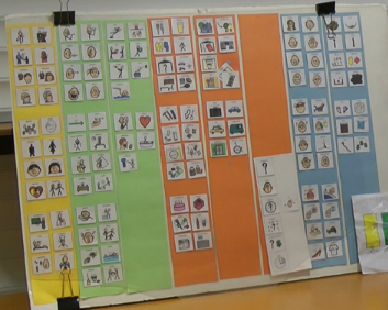 El tablero se construye en cartulina y está dividido en tres partes. Sobre cada parte se pegan los símbolos, previamente seleccionados y montados en el ordenador. Luego se plastifica, de forma que no se deteriore fácilmente y pueda ser transportado y manipulado con seguridad. Este es el resultado: